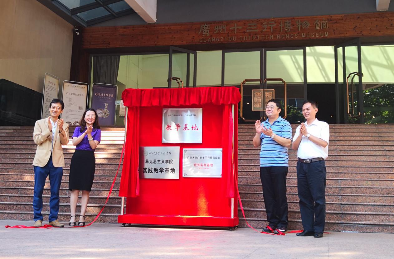 9月30日上午,365英国在线体育广州十三行博物馆实践教学基础揭牌仪式在广州十三行博物馆门前广场隆重举行,马院经理蔡立彬教授(右一)和广州文化公园副主任、广州十三行博物馆馆长孙莉女士(左二)等亲自为实践基地揭牌,李增添、徐满泽老师带领47名员工参加了仪式并在仪式结束后进行了现场参观教学。
