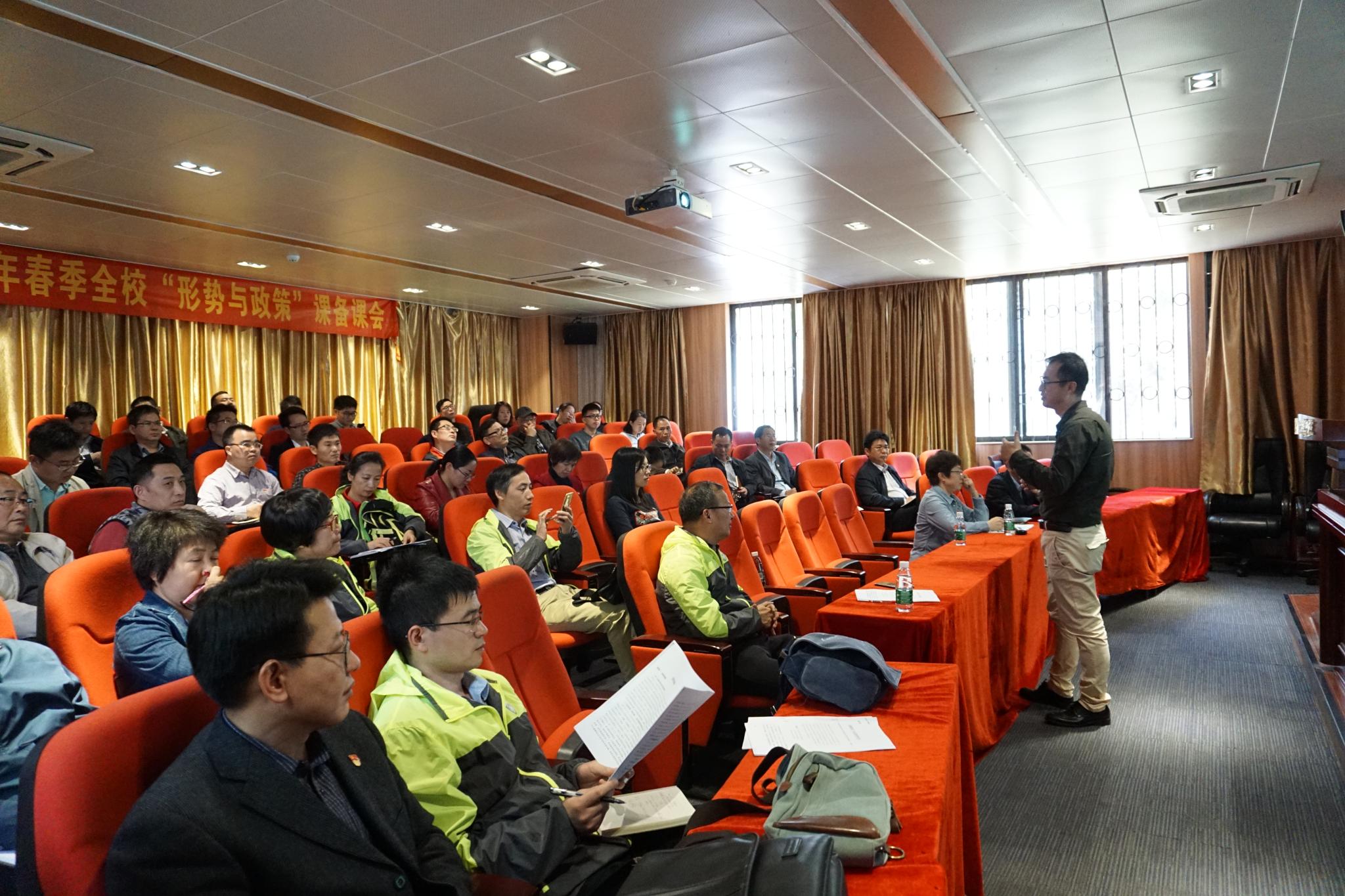 华南师范大学365英国在线体育、政治与行政公司唐昊教授首先以美国前总统奥巴马为例介绍了世界上教育比较发达的国家在开学日由国家领导人上第一课的惯例,指出“第一课”在国家育人战略的重要作用;分析了2018年春季形势与政策课教学要点将围绕十九大报告和习近平新时代中国特色社会主义思想选择国内和国际授课专题;随后进行了《对外战略:构建人类命运共同体》的现场教学展示。唐教授以“中美贸易战”热门话题为切入点,从全球化与逆全球化、十九大报告的“构建新型国际关系”、中国外交新思路和改善大国关系四个方面系统全面分析了中国新时代“构建人类命运共同体”的对外战略。唐教授现场教学展示思路清晰、精辟深入,既有理论高度,又有丰富案例数据,娓娓道来,说服力和感染力强。