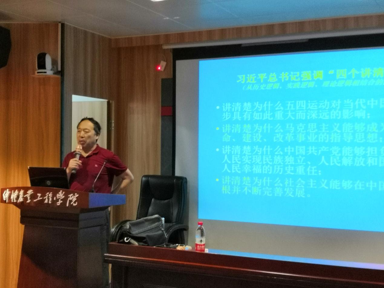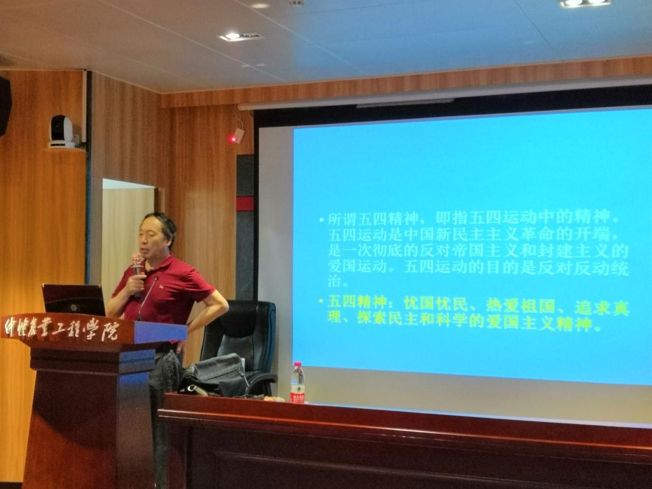 赵教授梳理了五四运动思想史,先后阐述了三个问题:第一,五四运动的历史意义与中国共产党;第二,“五四精神”与新时代“爱国奋斗精神”;第三,新时代中国特色社会主义与中华民族伟大复兴。关于第一个问题,赵教授从对“新文化运动”的理解揭示五四运动与中国共产党之间的紧密联系。关于第二个问题,赵教授首先阐释了五四精神的核心内容为“爱国、进步、民主、科学”。他说五四精神归结起来是:忧国忧民的爱国主义精神,无私奉献的高度社会责任感,宣传民主科学的进步精神,追寻时代潮流、把握时代命运的伟大精神;站在中国革命的高度也可以概括为:爱国主义精神、民主科学精神。接着解读了习近平总书记在十三届全国人大一次会议闭幕式上的重要讲话中提出的新时代中国精神即伟大创造精神、伟大奋斗精神、伟大团结精神和伟大梦想精神,与五四精神之间的深层联系。关于第三个问题,赵教授指出通过前面两个问题的解答,我们谈五四精神、新时代爱国奋斗精神,归根到底都是为了实现中华民族伟大复兴这一共同理想。通过赵教授的讲解,同学们加深了对五四运动的历史意义、五四精神的理解及其当代价值,也加深了对新时代中国精神的理解。