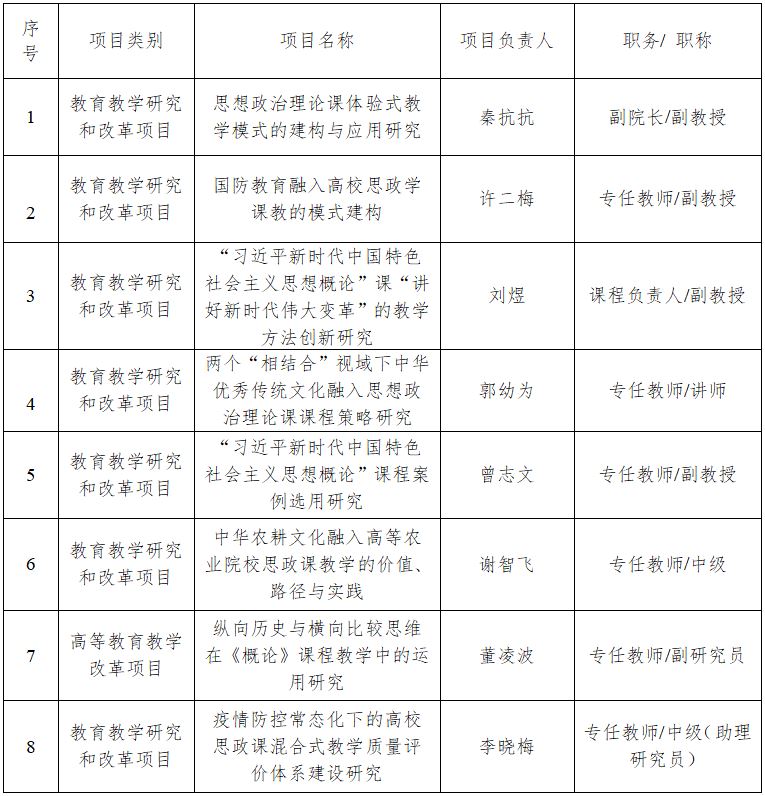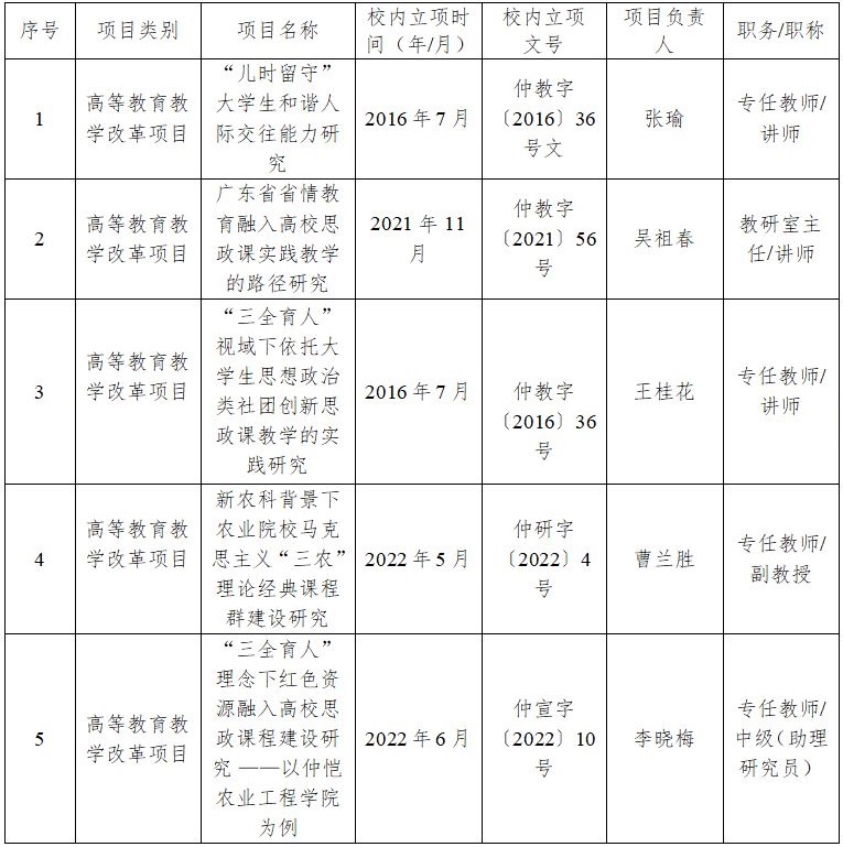根据《广东省教育厅关于开展2022年度广东省本科高校教学质量与教学改革工程项目申报推荐工作的通知》以及公司《关于开展2022年度广东省本科高校教学质量与教学改革工程项目申报推荐工作的通知》(仲教字〔2022〕39号)工作要求,经过资格初审、专家遴选等环节,公司现向公司教务处推荐以下项目申报: