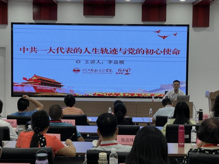 下午,研修班学员前往嘉兴公司党员教育基地参加理论学习,浙江红船干部公司、中共嘉兴市委党公司党史党建教研室李益模副教授作了“中共一大代表的人生轨迹与党的初心使命”的理论教学。李益模从三个方面展开教学:一是围绕千年变局、红船起航的大背景,讲述了中国人民探寻初心使命的历史进程;二是以生动的案例详细介绍了中共一大代表的人生轨迹,深入阐释“相同起点、不同终点”背后的奋斗故事;三是从不同的人生轨迹中汲取现实启示,激励着全体学员在以后的教学工作中要筑牢信仰之基、增强动力之源、实践奉献之旨、履行担当之责。