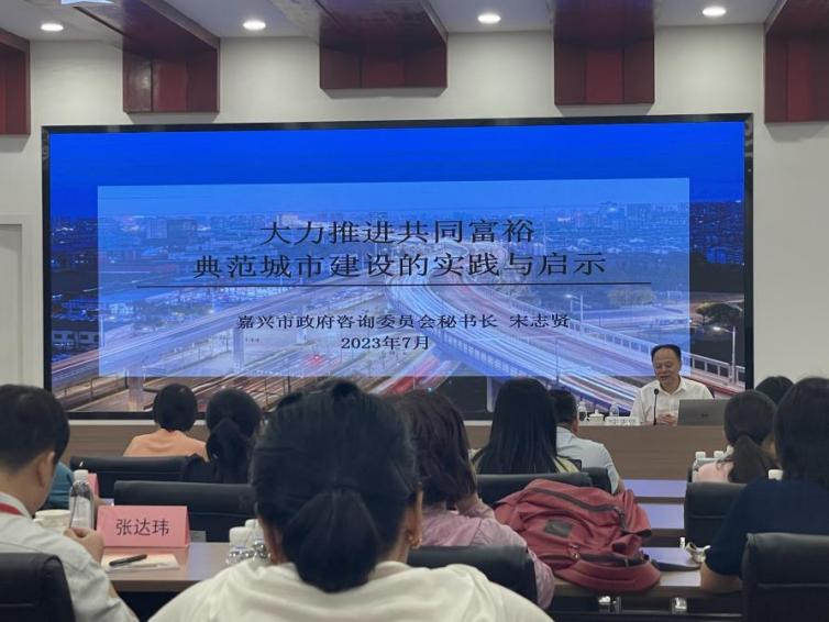 晚上,嘉兴市政府咨询委员会秘书长宋志贤以“大力推进共同富裕典范城市建设的实践与启示”为题,向研修班学员讲述了嘉兴市推进共同富裕建设的生动故事。宋志贤指出,嘉兴地处长三角一体化区域的核心位置,是初心使命孕育的地方,有着浓厚的历史文化。宋志贤详细介绍了嘉兴地名的演进历程、户籍人口的基本情况、嘉兴市的经济社会发展情况,层层递进,深刻阐释了嘉兴市推进共同富裕建设的实践性认识、阶段性成果以及实践启示。