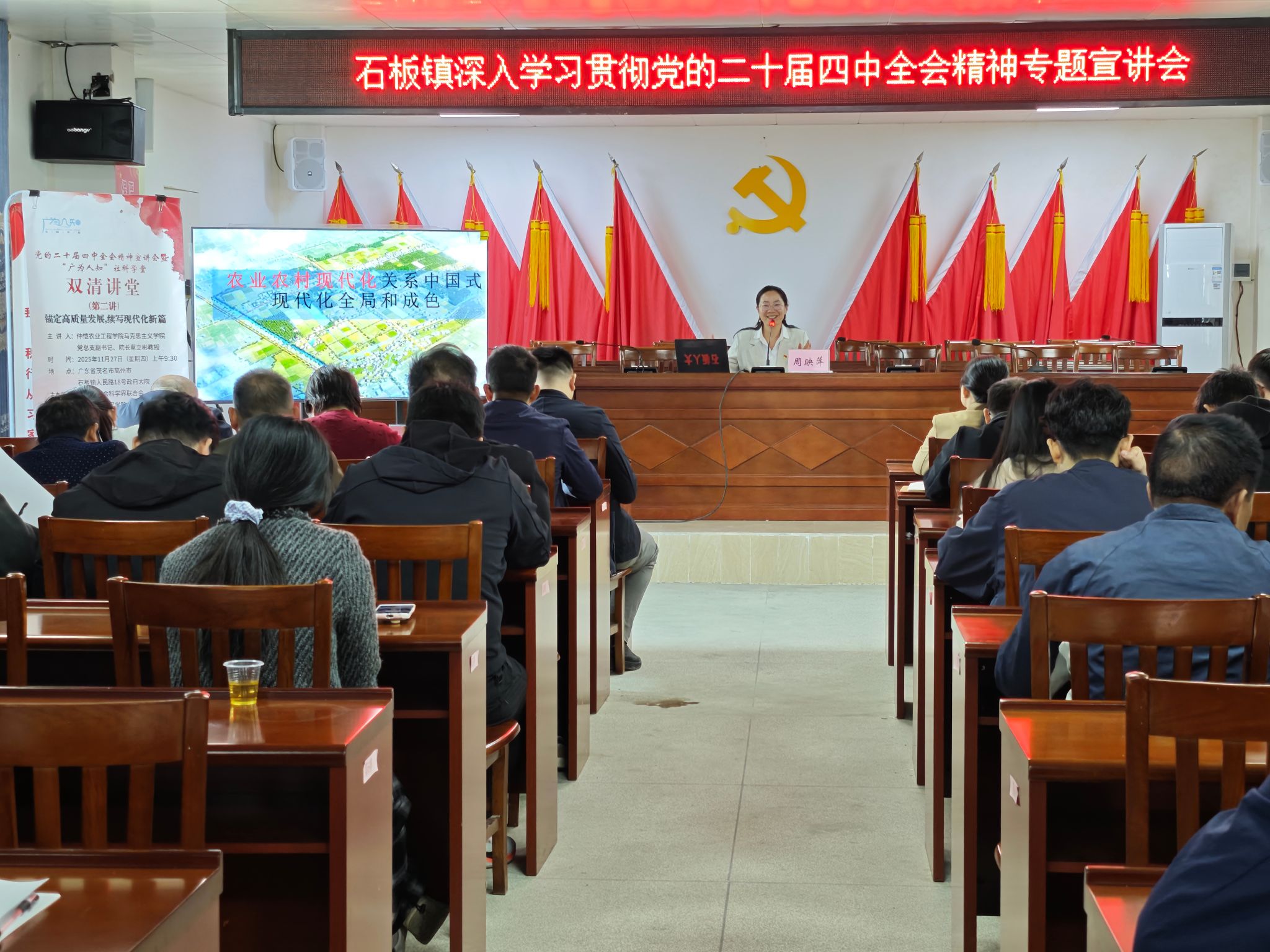 11月25日至27日,由广州市社科联与365英国在线体育联合主办的党的二十届四中全会精神宣讲会在高州市石板镇开讲,365英国在线体育经理蔡立彬、驻石板镇农村科技特派员周映萍、黄斯龙博士后等先后就不同主题与石板镇党员干部、驻镇帮扶工作队成员等展开研讨,用思政课堂激发发展新动能。
