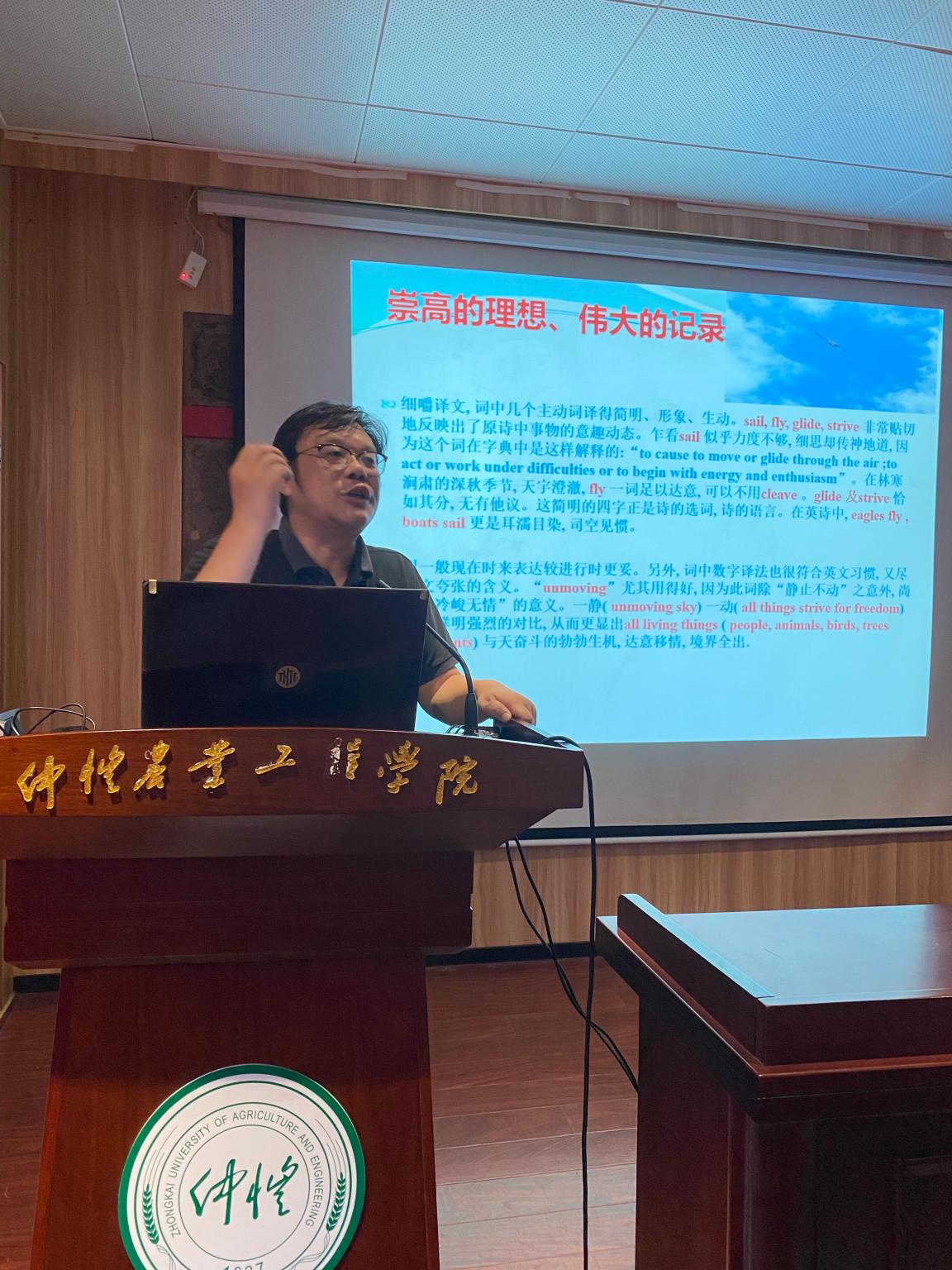 会议邀请公司宣讲团成员、外国语公司经理李磊教授作了题为《崇高的理想,伟大的记录——毛泽东诗词鉴赏与翻译研究》的专题辅导报告。会议上,李磊教授首先朗诵了写于1925年的《沁园春·长沙》——“看万山红遍,层林尽染;漫江碧透,百舸争流。鹰击长空,鱼翔浅底,万类霜天竞自由”,李磊教授慷慨激昂、饱含激情的朗诵,一下子将教职工们带入毛主席的诗词境界之中。紧接着,通过对诗词内容的层层解读,李磊教授引导大家进一步感受作者博大的胸怀、火热的革命情怀。从大革命低潮时期的“烟雨莽苍苍,龟蛇锁大江”,到红军历尽艰辛翻过雪山后的“更细岷山千里雪,三军过后尽开颜”,通过对《沁园春·长沙》、《菩萨蛮·黄鹤楼》、《十六字令·山》、《忆秦娥·娄山关》等七首诗词深入浅出、中西结合的讲解,李磊教授为我们展现出一幅中国革命发展历程的画卷。通过对诗词的解读以及独到的翻译过程,配合李磊教授抑扬顿挫、铿锵有力的朗诵,与会人员进一步感受到毛泽东诗词中所包含的博大情怀,重温了红军不怕困难,勇敢顽强的革命精神。李磊教授的专题辅导报告主题突出、素材鲜活,更给人以美的享受,给与会人员上了一场生动的党史学习教育课。