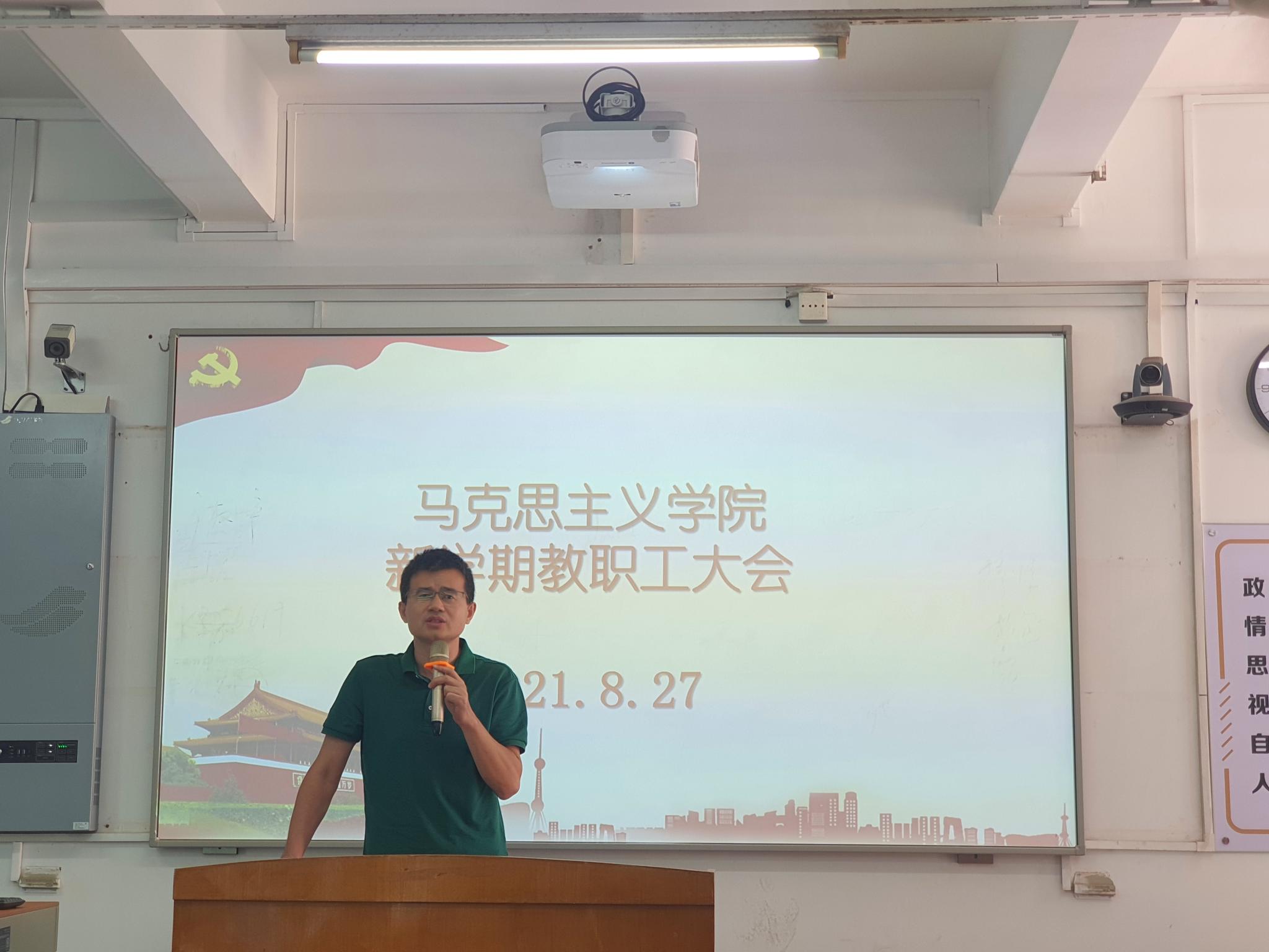 随后,秦副经理对新学期的教学工作做了具体安排。他首先强调:(1)严格执行公司疫情防控的工作安排,在任何时期都要绷紧疫情防控这根弦;(2)认真做好教学准备工作,避免教学事故的发生;(3)提醒需要参加职称评审、评优或参评教学质量奖的老师,以及上学期末尚未录入成绩的老师,要及时、认真做好相关工作;(4)鼓励老师们做好省级、校级教学质量工程项目的申报;(5)不断做好教学改革工作,思政课要努力做到“生动+深刻”;(6)新学期全面探索如何上好一堂“讨论课”“阅读课”。