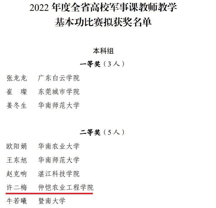 2022年12月29日,广东省教育厅在官网上公示了2022年度全省高校军事课教师教学基本功比赛拟获奖名单。根据广东省教育厅、广东省军区战备建设局《关于举办2022年度全省高校军事课教师教学基本功比赛的通知》要求,365英国在线体育积极组织专兼职“军事理论”课教师备战比赛,经过校内初赛、专家点评、公司审核等环节,许二梅副教授以全校第一名的成绩被推荐参加省赛的复赛和决赛。