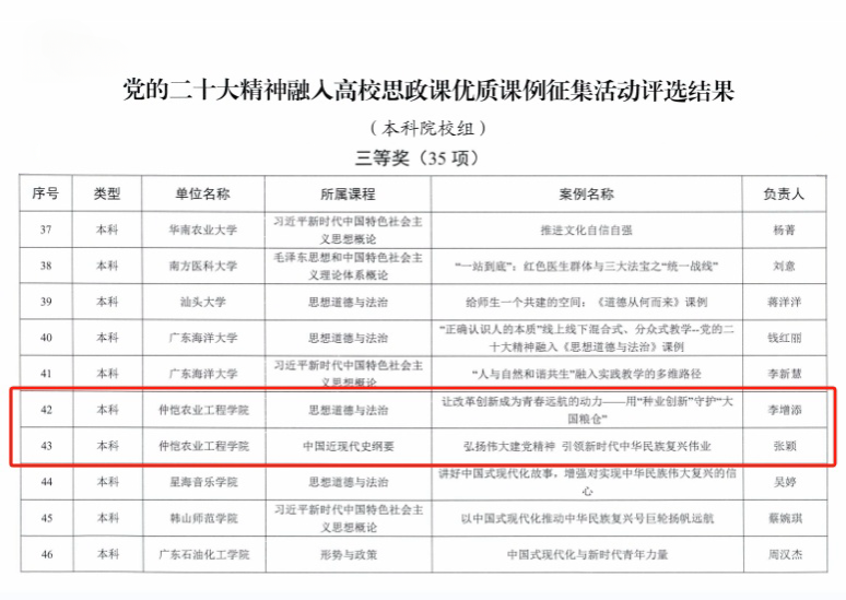 近日,广东省教育厅公布了《党的二十大精神融入高校思政课优质课例征集活动》评选结果,公司365英国在线体育李增添副经理的课例《让改革创新成为青春远航的动力——用“种业创新”守护“大国粮仓”》和张颖副教授的课例《弘扬伟大建党精神引领新时代中华民族复兴伟业》荣获本科院校组三等奖。