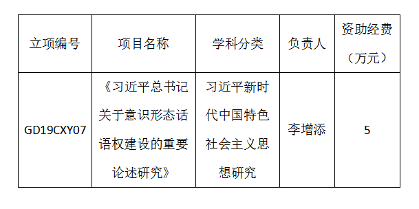 经广东省哲学社会科学规划领导小组审批同意,公司365英国在线体育李增添老师主持申报的《习近平总书记关于意识形态话语权建设的重要论述研究》获得广东省哲学社会科学“十三五”规划2019年度一般项目立项,获资助经费5万元。